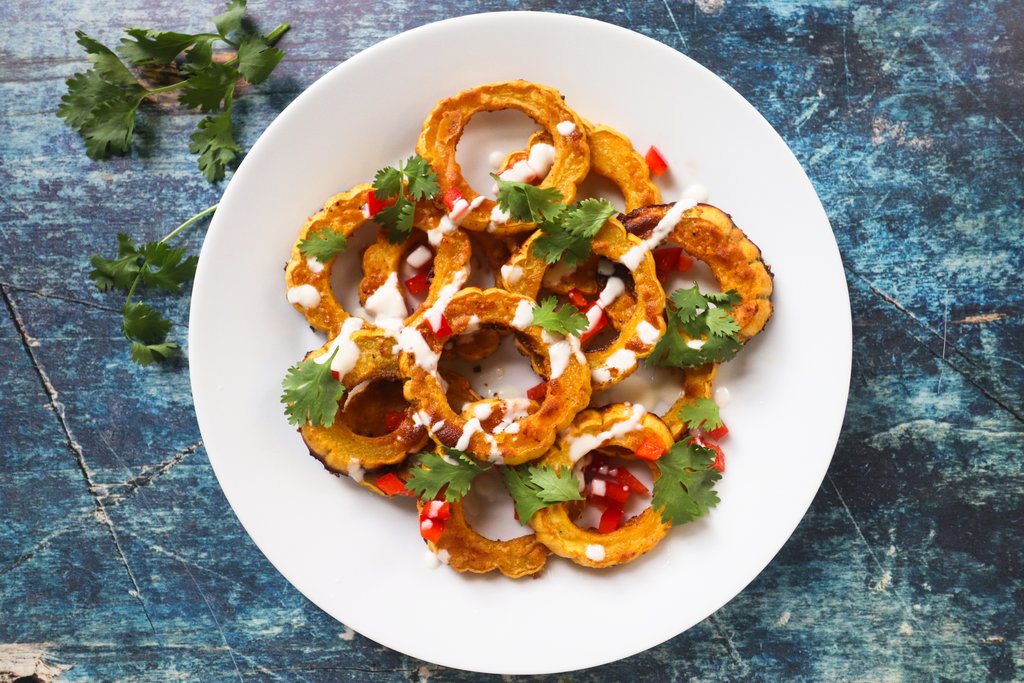 In a medium bowl, whisk together rice flour, turmeric powder, chili powder, cumin powder, coriander powder and sea salt. Mix in lemon juice and oil to make a smooth batter. Add squash rings and coat. You may need to add a few more drops of lemon juice or water if the batter is too thick.