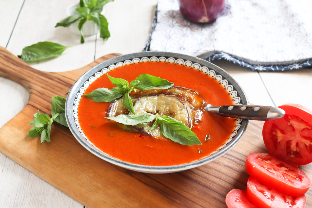 Reserving a couple slices eggplant for garnish, scrape rest of vegetables and cooking juices into large Dutch oven. Stir in vegetable broth and coconut cream. Bring to boil over medium-high. Remove from heat. Purée soup with immersion blender or transfer to blender and pulse. Stir in vinegar and season with sea salt and pepper, to taste. Divide between two bowls, top with eggplant pieces and torn basil.