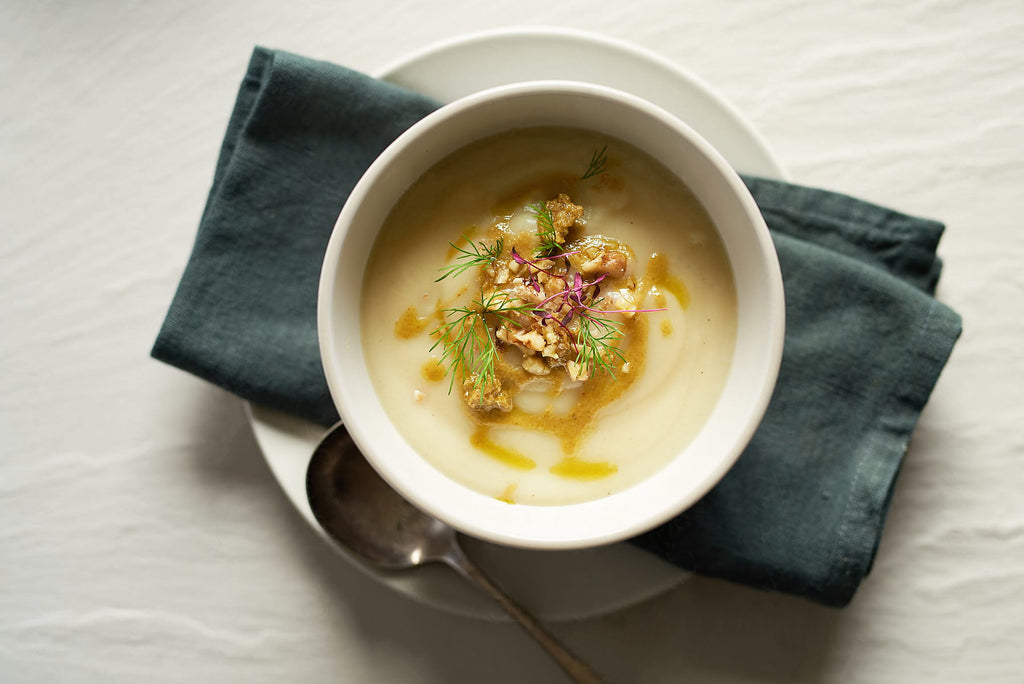 Heat one tablespoon olive oil in a large pot. Add onion and sauté for 5 minutes. Add one quart of chicken stock, or water, and bring to a simmer. Add apples and turnips to pot. Simmer for five minutes. Purée soup with an immersion blender or in a blender, in batches. Adjust consistency to your liking with a bit of stock or water, and season, to taste, with salt and pepper. Divide between bowls and top with maple nuts.