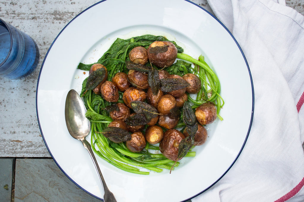 Melt 1 Tbsp. butter in medium skillet over medium flame. Add sage leaves and cook 3 to 5 minutes, or until darkened, crisp and slightly curled. Remove from pan and set aside. Add garlic and 1 Tbsp. butter to the pan; sauté for one minute and add broccoli rabe leaves. Cook, stirring occasionally and lowering heat as necessary to prevent scorching, until rabe is tender, about 5 minutes. Transfer to a dish and serve with roasted potatoes and crispy sage.