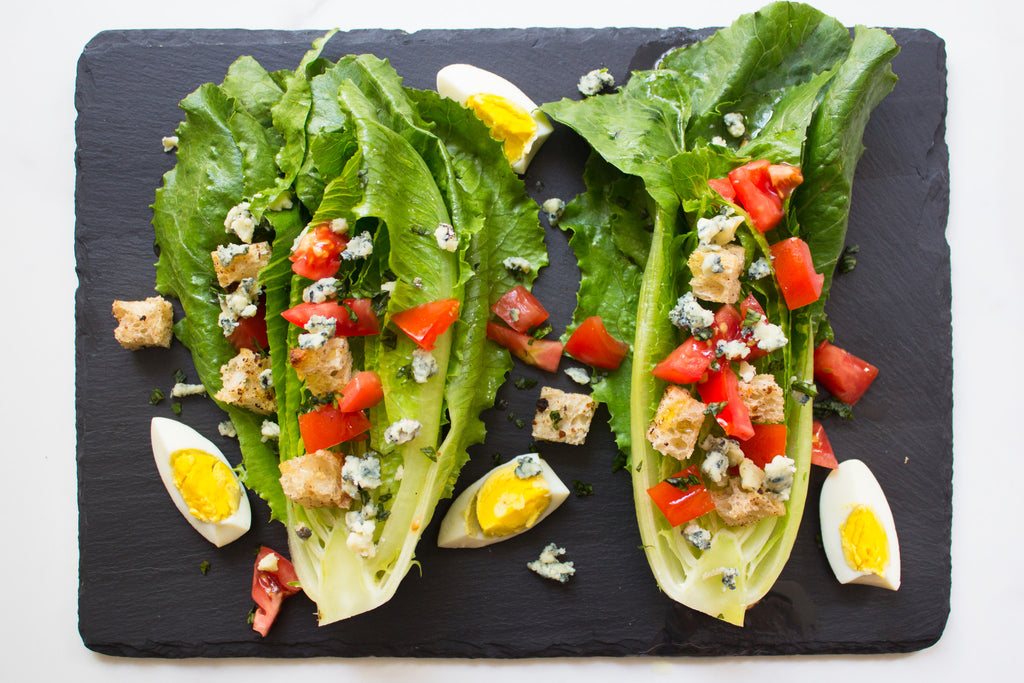 Divide the romaine among two plates. Top evenly with the croutons. Stir together the vinaigrette and dress the wedges. Garnish evenly with the tomatoes, Roquefort and chopped egg.