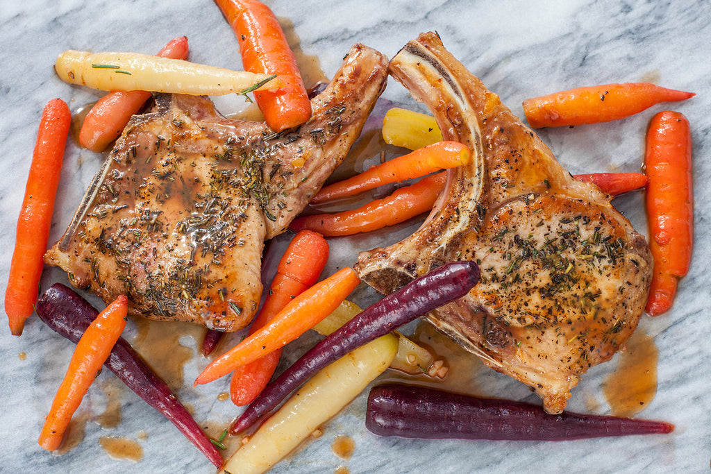 While pork is cooking, place cider in sauté pan over medium heat. Reduce by at least half. When carrots are tender, remove from oven and add to sauté pan along with butter. Simmer a few minutes (your pork chops should be out of oven and resting at this point) to absorb cider glaze. Serve chops with glazed carrots.
