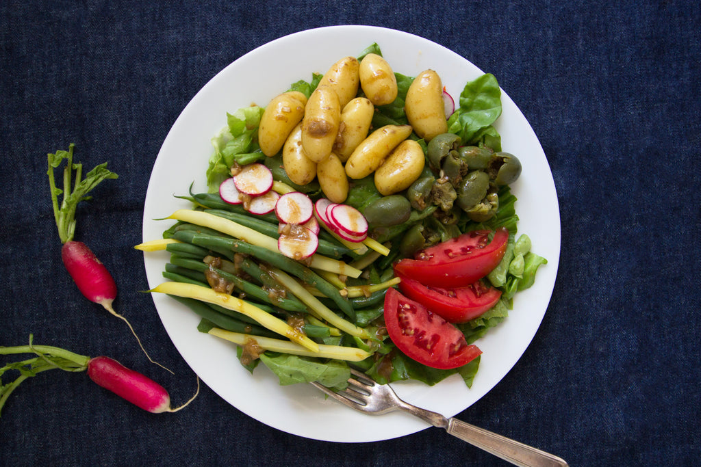 Arrange bed of lettuce on a serving platter. Arrange the green beans, olives, potatoes, tomatoes and radish in mounds on top of lettuce. Drizzle dressing over salad and serve.