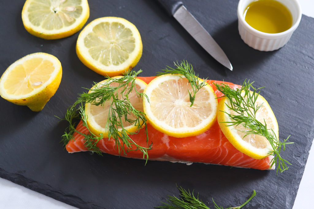 Place salmon skin side down in the baking dish. Arrange lemon slices and fresh herbs on top, covering the salmon. Pour white wine into the baking dish, and then cover with aluminum foil.