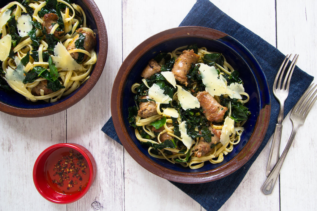 While pasta cooks, add kale to sausage in skillet and sauté, stirring frequently, until just tender, about 5 minutes. Add broth, stirring and scraping up any brown bits from bottom of skillet, then add pasta and 1/2 cup reserved cooking water to skillet. Toss until well combined. Divide pasta between 2 bowls and sprinkle with shaved cheese, minced basil and red pepper flakes.
