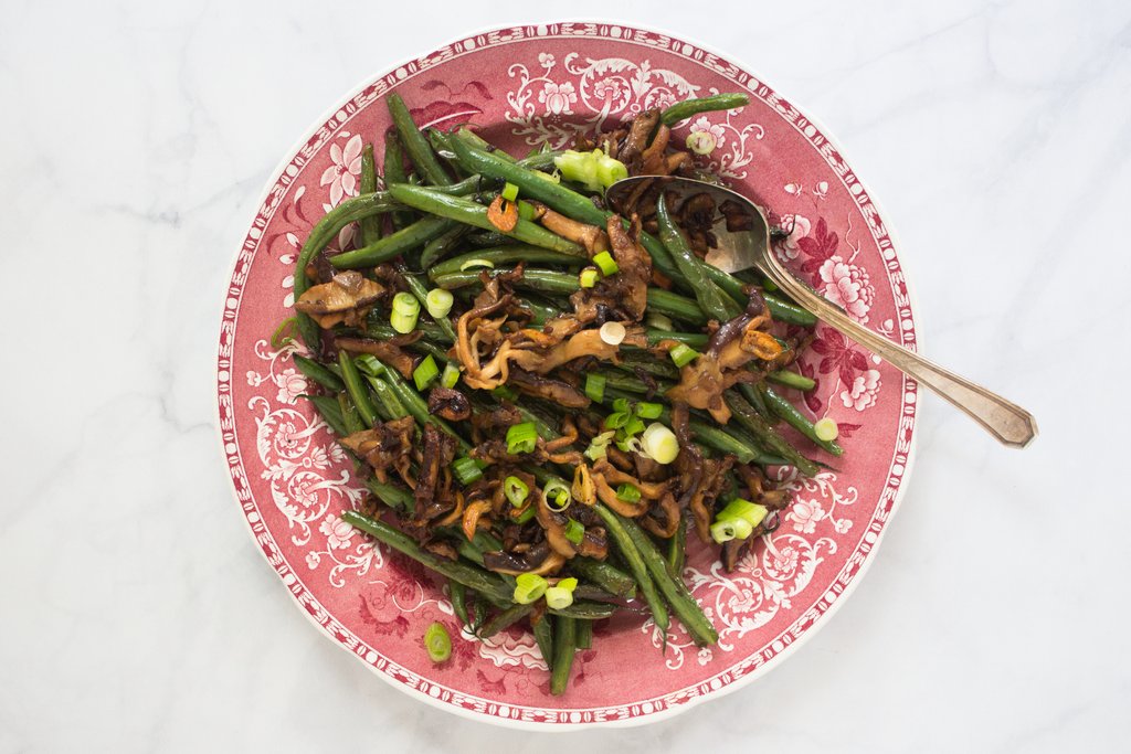 Heat 1 tablespoon oil in a large skillet, add garlic slices and cook until golden brown and crispy. Remove garlic from hot pan and add sliced mushrooms. Sauté mushrooms over medium-high heat for 7 minutes, until they begin to brown and turn crispy. Add more oil, if needed. Season with a sprinkle of sea salt. Remove mushrooms from pan and set aside. Add another tablespoon of oil to pan along with blanched string beans and soy sauce. Sauté for 5 minutes. Plate green beans and top with crispy mushrooms and garlic.