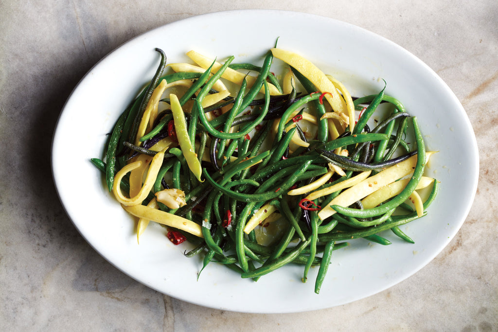 My friend Laura Ferrara and her husband, Fabio, own the beautiful Westwind Orchard in Accord, New York. It’s a very special place. In addition to having a farm and selling organic apples, they also cook pizzas to order from a wood-fired oven Napoletano-style. I visited Laura one hot August day, and as I was leaving she started piling produce in my bag. Among her gifts were garlic, beautiful fresh and crinkly cayenne peppers, and stunning flat Romano beans. As she shooed me away like an Italian mama, she gave me very simple directions: Sauté the garlic and the peppers and then add the beans. I did exactly as she instructed.
