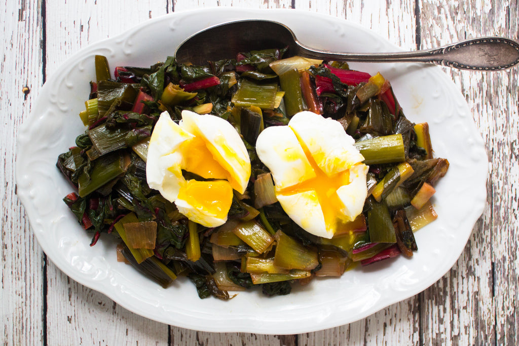 Gently transfer eggs into simmering water. The egg whites will coagulate instantly. Poach the eggs for 3 minutes spooning the simmering water over the eggs. When the whites become opaque and feel firm to the touch they are done. Gently remove eggs with a slotted spoon and lay them on sheets of paper towel to dry. When leeks and chard are done transfer to a serving dish and top with poached eggs.