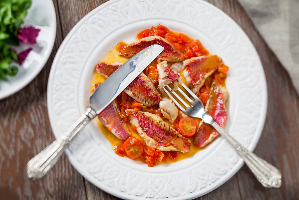 Place the skillet in the preheated oven and bake for about 12-15 minutes or until the redfish easily flakes with a fork and the cherry tomatoes have softened and begun to caramelize.