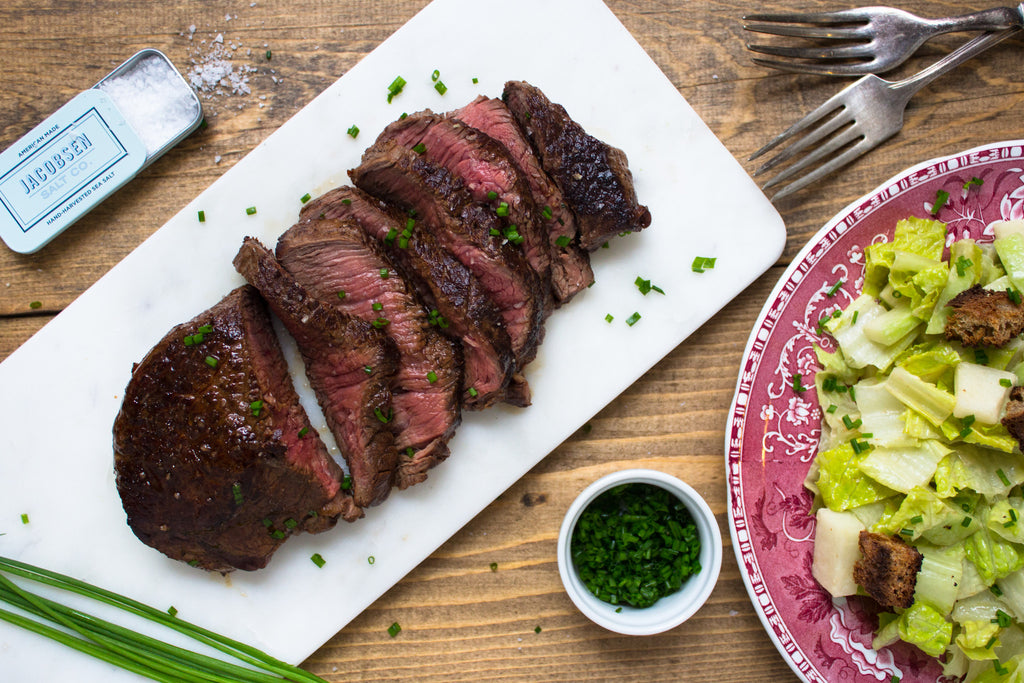 Season the steak generously with salt and pepper. Heat the remaining oil in a large sauté pan over a high flame until hot. Place the steak in the pan and cook for 4 minutes on each side for medium rare or 6 minutes for medium. Remove to a cutting board and rest the steak for as long as you cooked it.