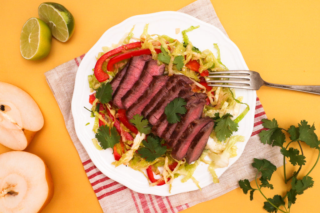 Coat a skillet with a bit of cooking oil and set over high heat. When skillet is hot, sear the steak for 3-5 minutes per side until cooked to your desired level of doneness. Set the steak on a cutting board to rest. Slice the meat against the grain into ¼-inch servings. Lay over cabbage salad, top with cilantro leaves and sprinkle with flaky salt.