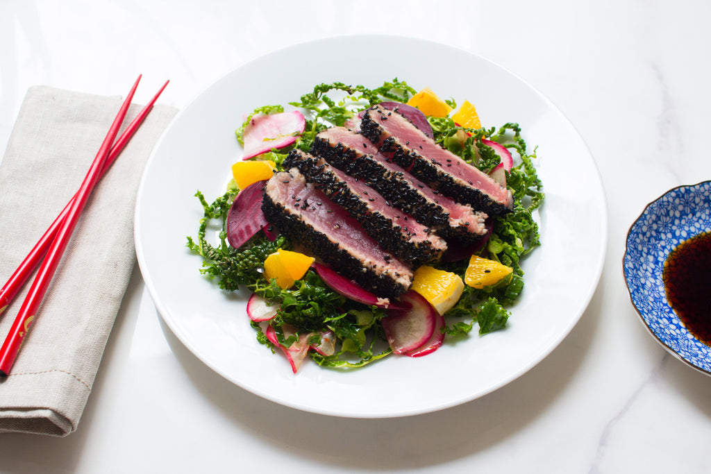 Plate a layer of the salad, then splay sliced tuna steak across the top. Sprinkle with leftover sesame seeds.
