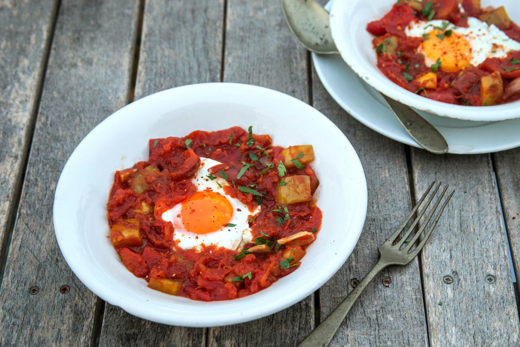 In large skillet, sauté garlic and onion in olive oil over medium-high heat for 2 minutes. Add tomato paste, Sriracha, and spices, and stir together into a paste. Sauté another 3 minutes until onions have softened and herbs have darkened. Add peppers and cook 3 minutes. Add chopped tomatoes. Continue to sauté until mixture begins to brown and stick to bottom of pan. Add can of crushed tomatoes and use a wooden spoon to loosen the brown bits. Season mixture with sea salt and pepper (canned tomatoes can absorb a lot of salt, so be liberal). Stir occasionally 15 minutes, adjusting heat to maintain a simmer. When sauce has thickened slightly, use a spoon to dig a small crater into sauce and crack an egg into hole. Crack 4-6 eggs, preparing a hole each time, equally spaced throughout pan. Turn heat low and cover pan. Cook 7 minutes, or until eggs are cooked but yolks remain runny. Remove from heat, and season each egg with sea salt and pepper. Sprinkle with za’atar, crumbled feta and cilantro leaves, if desired. Serve family-style in pan with crusty bread.