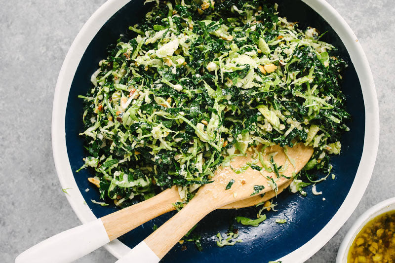 Using sharp knife or thinnest blade on mandoline, slice each sprout thinly. Slice onion in same manner. Combine shaved Brussels, kale, and onion in large bowl.