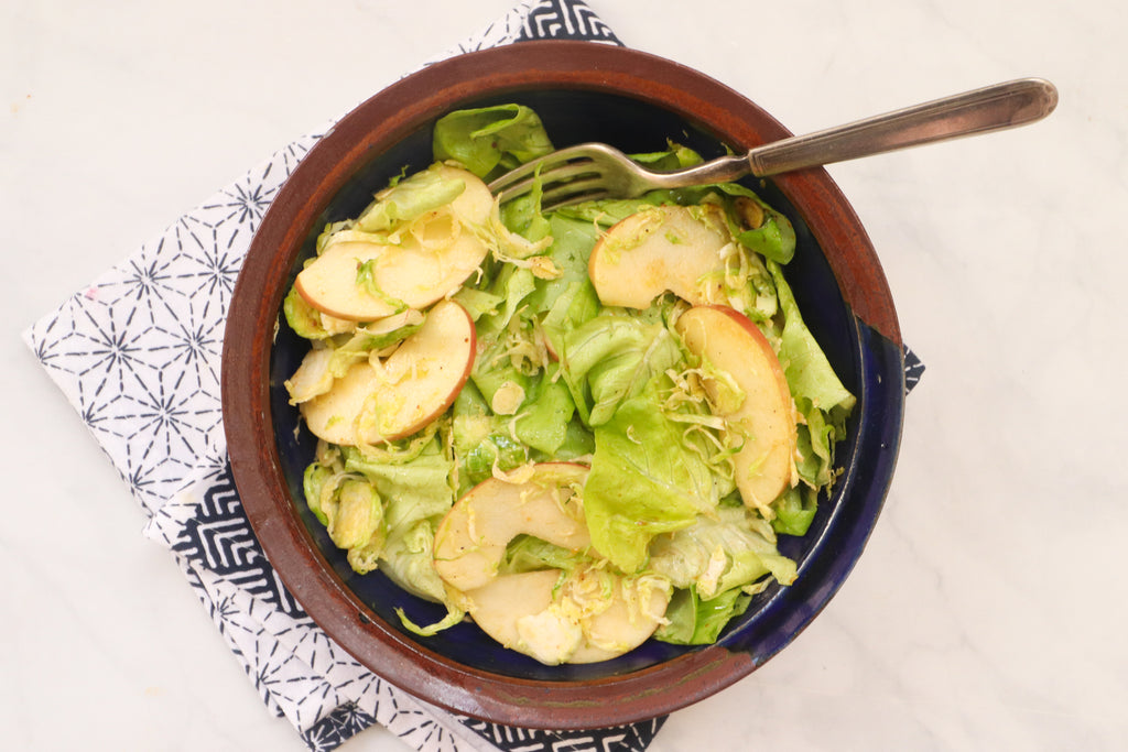 Using a sharp knife or the thinnest blade on a mandoline, slice each sprout thinly. Slice the apple in the same manner. Combine in a large bowl.