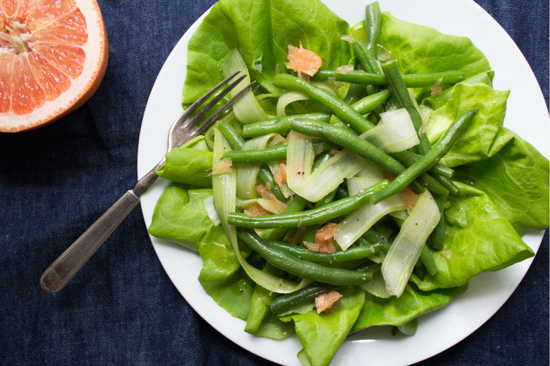 In a large mixing bowl, whisk together the remaining oil with the grapefruit juice and a pinch of salt and pepper. Strain the celery and green beans well and add them to the bowl along with the garlic. Season with a pinch of salt, to taste, and gently toss until combined. Divide the lettuce among 4 plates and top evenly with the salad.