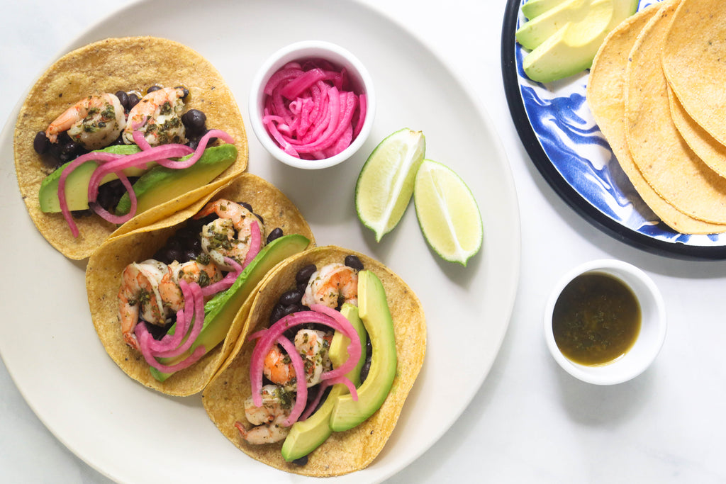 Divide black beans and shrimp between tortillas. Drizzle with more chimichurri, if desired, and top with quick pickled onions and sliced avocado.