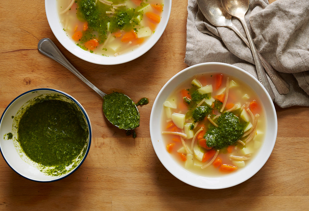 Pistou is the Provencal counterpart to Italy’s pesto. It is made without nuts so it’s a bit lighter. One of the traditional uses for pistou is as a condiment for vegetable soups. You can add some sautéed broccoli raab to this soup, or half a cup of leftover beans. This soup is a great way to use leftover bits of vegetables.