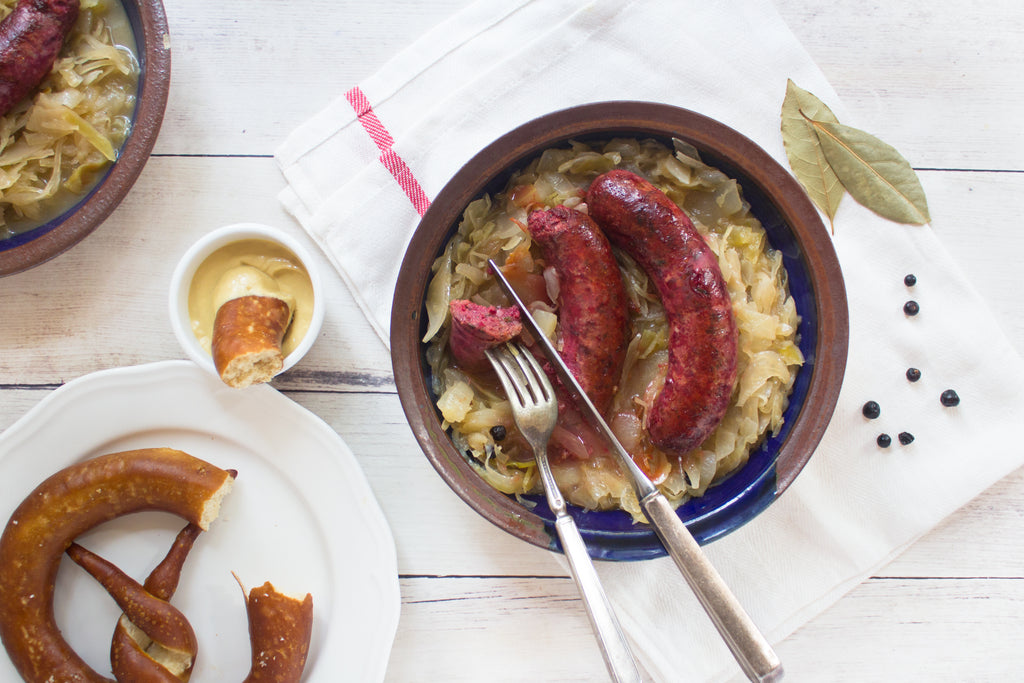 When choucroute is done, you can add a tablespoon of honey or sugar, if you prefer it a bit sweeter. Serve beet sausage on a bed of choucroute with spicy mustard. If you have extra choucroute, it will keep in the fridge for up to a week and can be eaten alongside almost any meat.