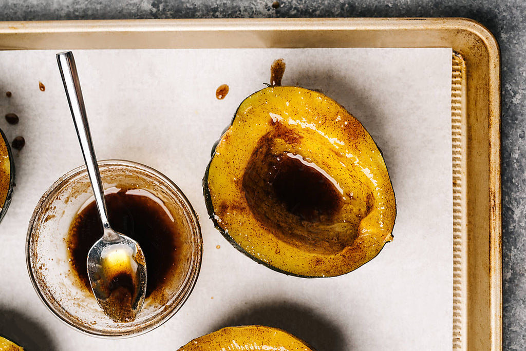 Fifteen minutes before squash is finished cooking, flip it cut side up and brush with soy maple glaze. Drizzle some extra glaze into cavity. Return squash to oven and cook 5 minutes longer, until maple mixture begins to caramelize.