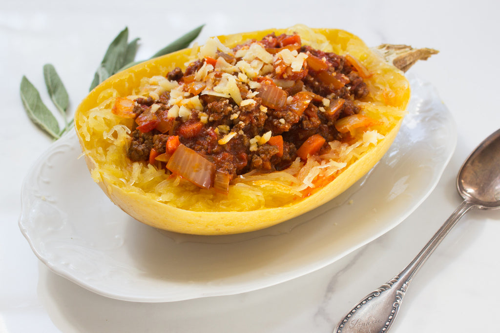 Cut squash in half and scoop out the seeds. Scrape the inside flesh with a fork to resemble spaghetti. Divide between 2 plates and top with the Bolognese.