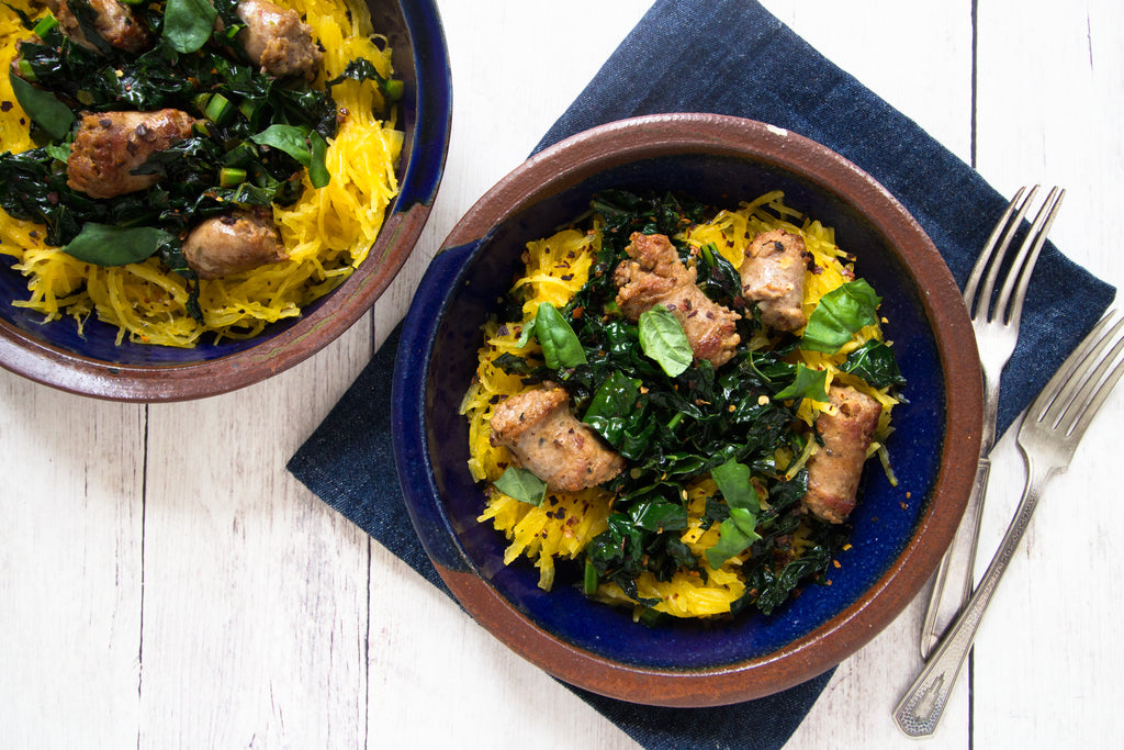 Spaghetti squash with kale and sausage sprinkle with minced basil and red pepper flakes.