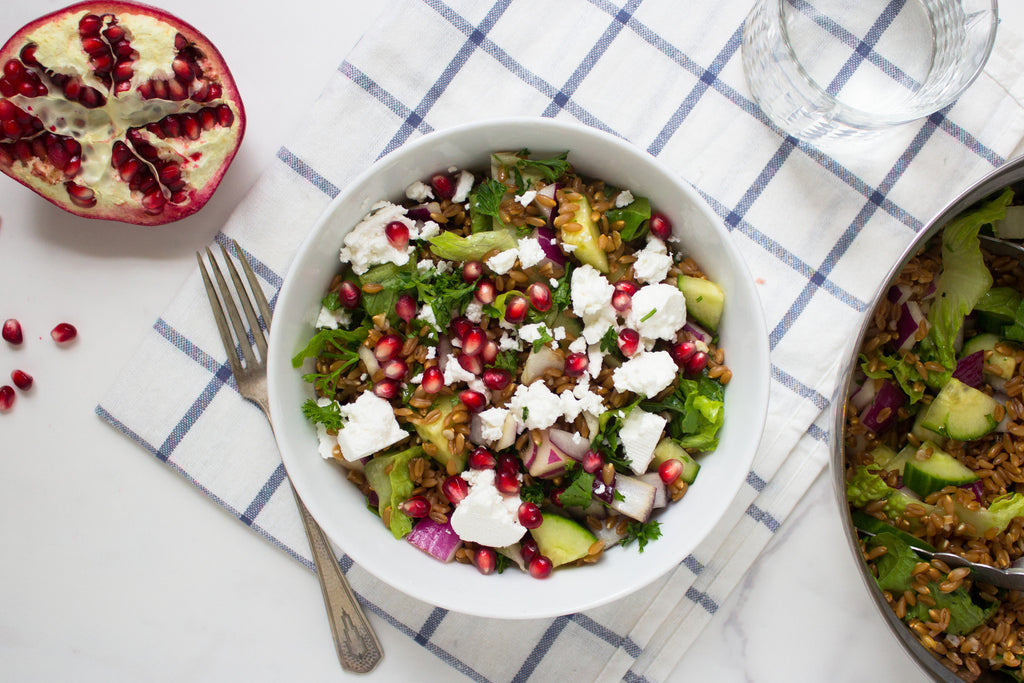When the spelt is done, whisk together the oil and vinegar in a large mixing bowl. Season with the sugar and a pinch of salt and pepper, to taste. Add the onion, cucumber, lettuce and parsley. Toss to combine. Add the spelt along with a pinch of salt and pepper. Mix together and divide among 2 plates. Garnish evenly with the feta and pomegranate seeds.