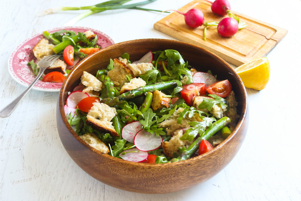 In a large bowl, combine asparagus, radishes, tomatoes, red onion, arugula, and bread; toss to combine. In a small bowl, whisk together red-wine vinegar and olive oil; season with salt and pepper. Pour vinaigrette over asparagus mixture, and toss until well coated. Let sit until bread absorbs juices, and serve.