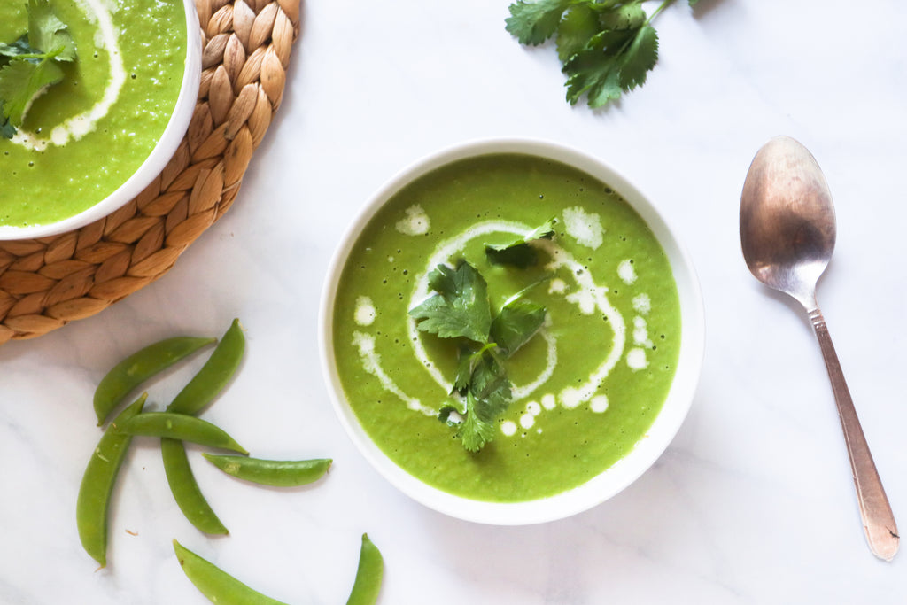 Add the vegetable stock and bring to a boil. Add fresh peas and cook for 5 minutes, until tender. Stir in cilantro. Remove from heat and transfer to a blender; pulse until very smooth (You may need to work in batches). Season with salt and pepper. Divide between two bowls, drizzle with cream, if desired, and garnish with more cilantro.