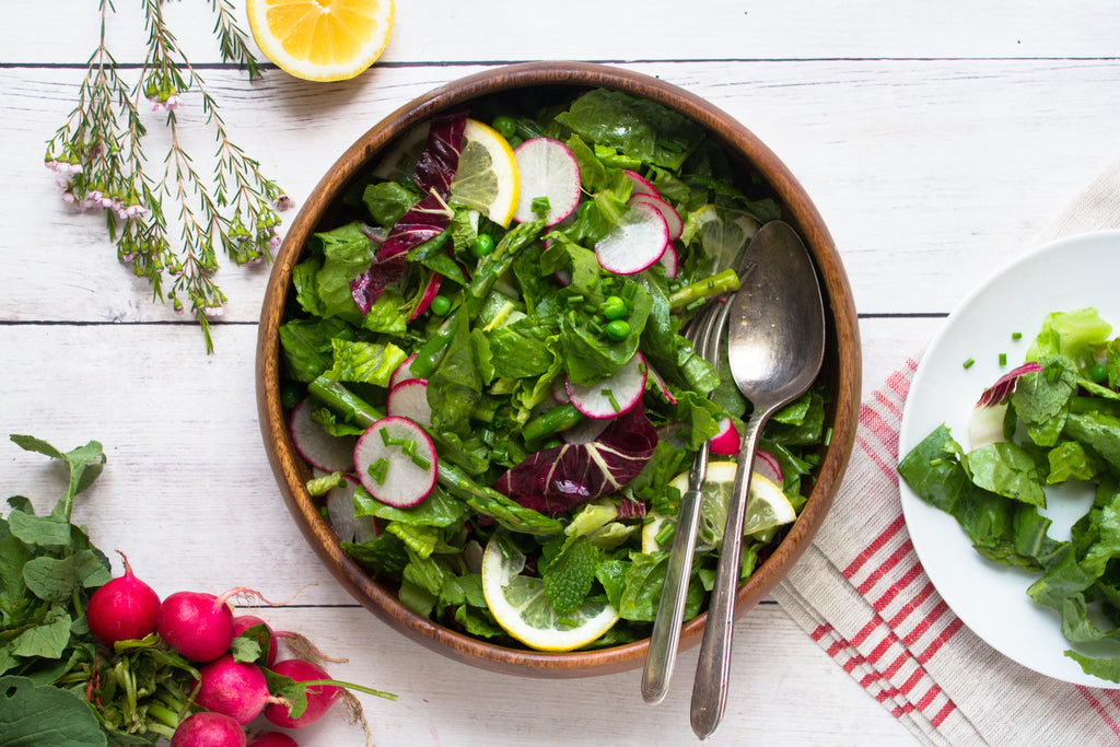 Meanwhile bring a small pot of salted water to a boil. Rinse asparagus, snap off the tough woody bottoms and cut into thirds. Add asparagus and peas to boiling water and cook for 5 minutes. Drain and run under cold water for 30 seconds. Rinse and chop lettuce. Using a mandolin or sharp chef’s knife thinly slice radish. In a salad bowl toss together, asparagus, romaine, radishes, peas and mint.