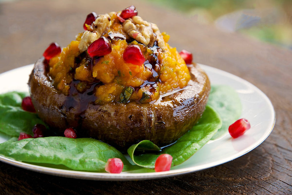 Spoon mashed squash onto each portobello mushroom. Top with roasted walnuts, if desired.