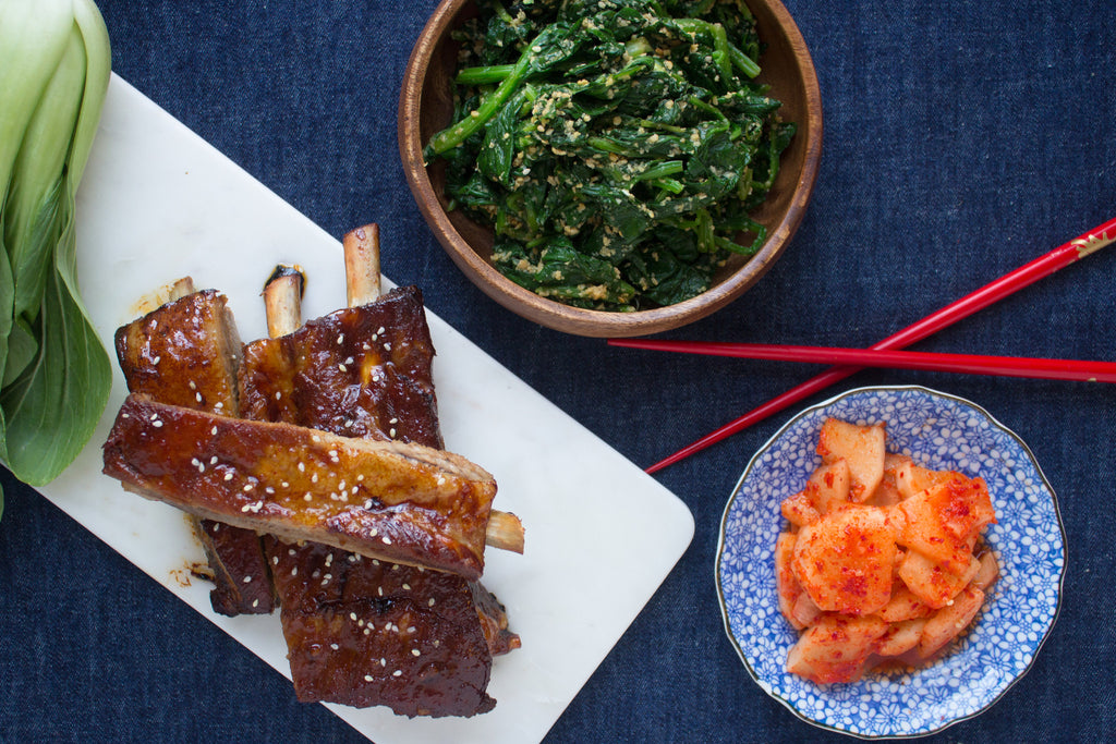 Mix together the sriracha, minced garlic, soy sauce. Put the ribs on a big piece of foil and rub marinade all over the ribs. Wrap the ribs up in the foil (make sure the seam of the foil packet is on top). Put the ribs in the oven and cook for 2 hours. Take the ribs out of the oven and unwrap them carefully over a skillet– they will have released some juices. The meat should have pulled back from the bone about ¼-½”. Pour the juice from the ribs into the skillet. Put the ribs on a baking sheet and turn the oven up to 425 degrees. Add the honey to the pork juices in the skillet and heat over low heat. Cook until juices have reduced and thickened. Brush the sugar glaze on both sides of the ribs and put them in the oven. Cook for five-ten minutes and then glaze again. Continue cooking and glazing until the ribs begin to have a nice dark brown, caramelized exterior, about 20-30 minutes total.