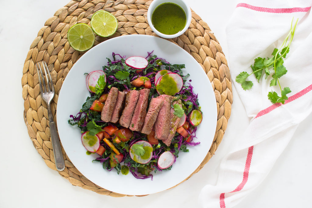 Pat the steaks dry with paper towels; season with salt and pepper on both sides. In a large pan, heat 1/2 Tbsp. olive oil on medium-high heat until hot. Add the steaks and cook until golden browned on both sides, about 3 or 4 minutes per side. Remove steaks from pan, let rest and then slice into 1/2 strips. Divide salad between two plates. Top with radish slices, diced tomato, sliced steak and cilantro lime dressing.