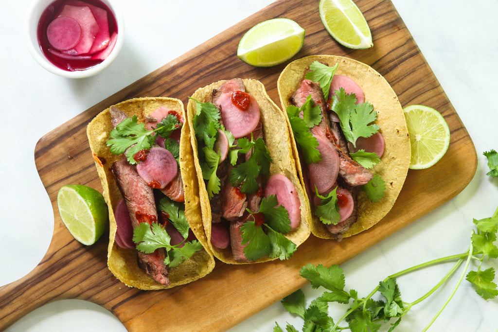 Season the steak generously on both sides with sea salt and pepper. Heat a heavy cast iron pan over medium-high. The oil will help the heat transfer from pan to steak. Sear the steak on each side for three to five minutes. Remove from the pan and let rest for five minutes. Wipe the pan clean and warm the tortillas. Slice the steak thinly and divide among the tortillas. Top with pickled radishes, cilantro and a drizzle of your favorite hot sauce.