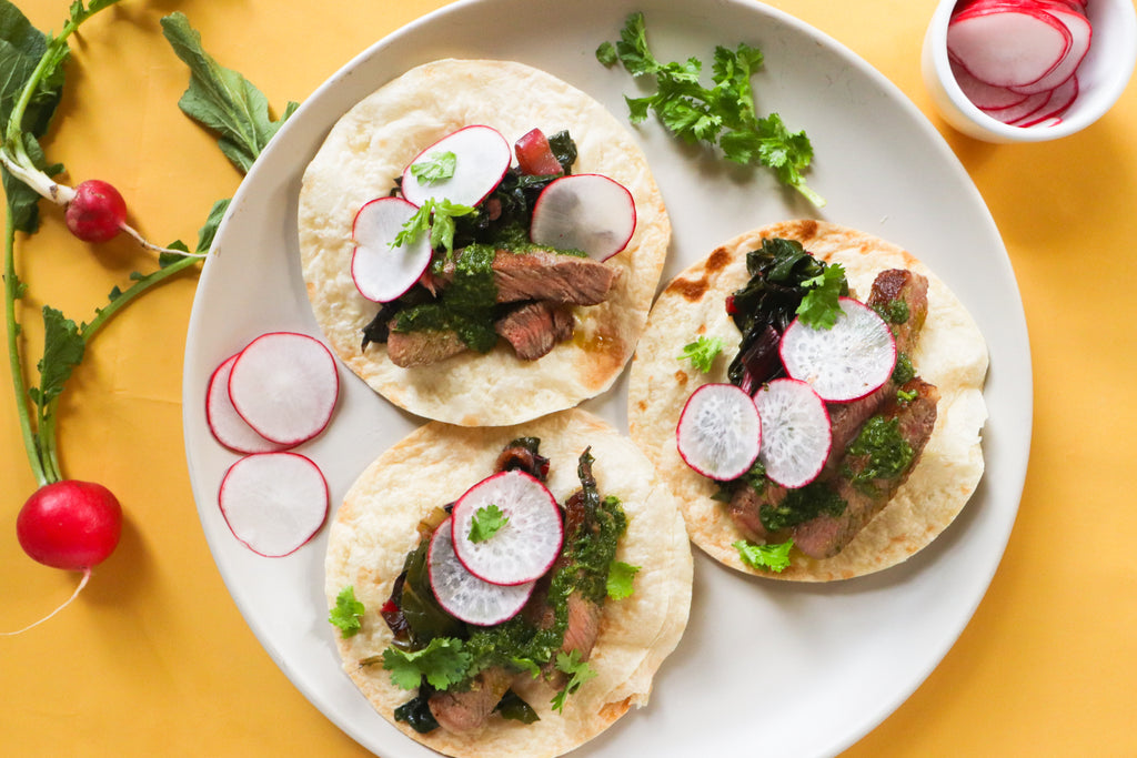 Heat 1 tablespoon cooking oil in a heavy cast iron pan over medium-high heat. Sear steak on each side for three to five minutes. Remove from pan and let rest for five minutes. Wipe the pan clean and warm the tortillas. Slice the steak thinly against the grain. Divide chard between tortillas. Add sliced steak to tortillas and top with cilantro sauce and sliced radishes.