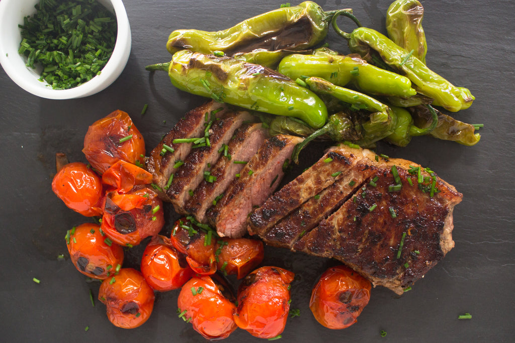 Coat a skillet with a bit of oil and put over high heat. Add the steak and cook for 3-5 minutes per side until cooked to your desired level of doneness. Set the steak on a cutting board to rest. Add cherry tomatoes and peppers to the same pan with a bit more oil and set the heat to medium-high. Cook until tomatoes and peppers begin to blister, turning every once in awhile. Season with flaky salt and minced chives. Slice steak into strips and serve with tomatoes and peppers.