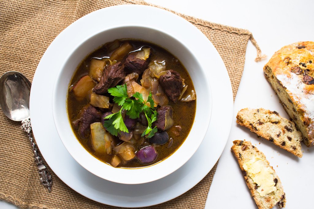 Pat stew meat dry and season generously with sea salt. Heat oil over medium heat in a dutch oven or stew pot. Add meat and sear 2 minutes, or until dark brown all over. Remove meat from pot; and set aside. Add diced onion to cooking juices from meat. Sauté until softened and slightly translucent. Add potatoes and cook a few minutes before adding cabbage, collards and mushrooms. Sauté a few minutes; then return stew meat to pot along with stock, stout beer, red wine and Worcestershire sauce. Bring to boil, then reduce heat. Simmer 40 minutes to an hour, until meat is tender and potatoes are soft. Feel free to add more broth or water to create a more soupy consistency. Add sea salt and pepper, to taste; and serve.
