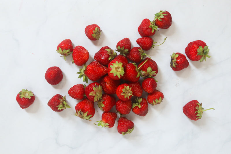 Pour batter into prepared skillet. Top with peaches, then strawberries. Gently press fruit into batter.