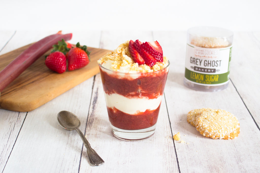 Add heavy cream to a large mason jar. Screw on the lid and shake for about 1 minute until thick. In glasses layer the strawberry rhubarb compote, whipped cream and crumbled lemon sugar cookies.