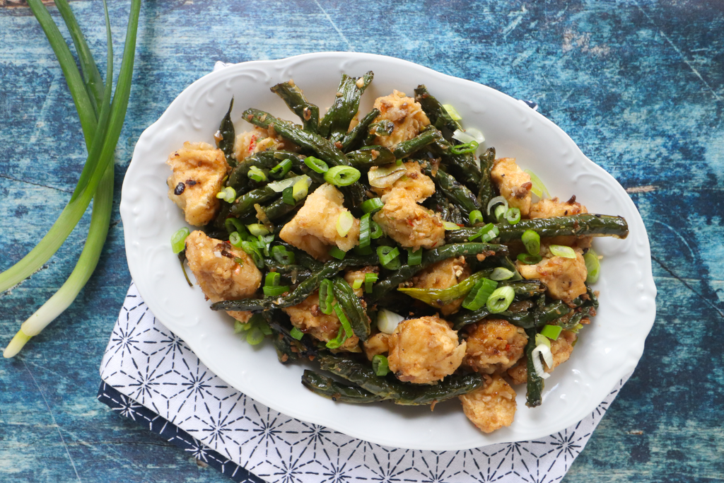 Add the green beans and stir fry them for 3-5 minutes or until they start to shrivel up a bit.