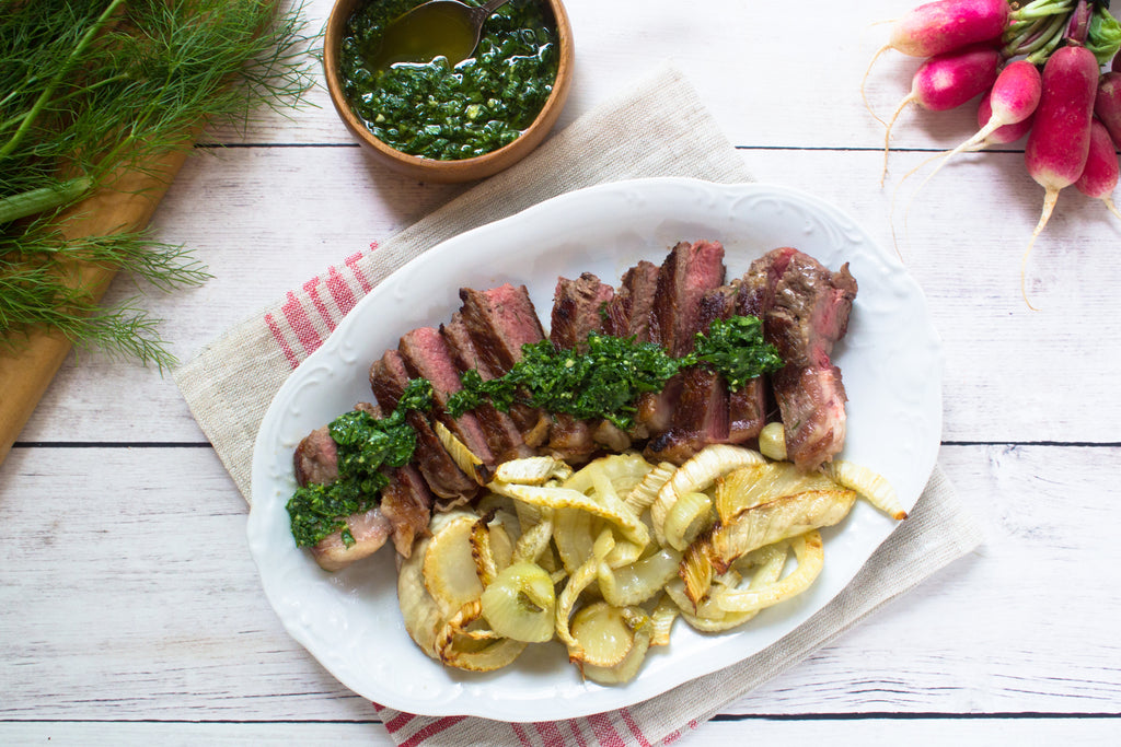 Sprinkle steak with salt. Heat a large cast-iron skillet over high heat. Add oil to pan and then steaks; cook 3 minutes on each side or until browned. Reduce heat to medium-low, add butter and crushed garlic to pan. Carefully grasp pan handle using an oven mitt. Tilt pan toward you so butter pools; cook 1 1/2 minutes, basting steaks with butter constantly. Remove steaks from pan and let stand 10 minutes, then cut into 1/2 inch slices. Serve with roasted fennel and chimichurri drizzled on top.