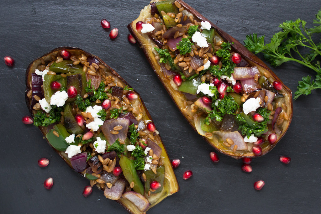 In a large mixing bowl, combine the cooked spelt with the kebab meat and vegetables. Divide the eggplants between 2 plates. Cut a long pocket into each and pry open gently with a spoon. Stuff each pocket generously with the spelt and meat mixture. Garnish evenly with the parsley, feta and pomegranate seeds.