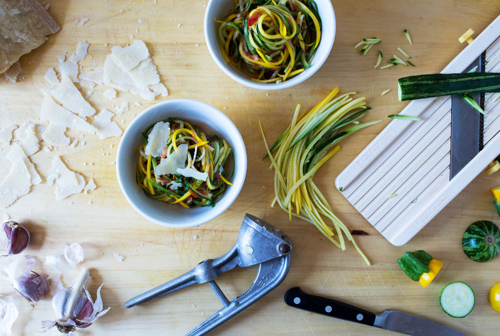 You’ll need a mandolin with a julienne attachment or a Japanese vegetable ribbon cutter to make this dish. In a pinch you can use a vegetable peeler to create long thin strips of zucchini. Wash the zucchini and trim off the ends. Cut the zucchini into noodles by running it over the mandolin lengthwise (with the julienne attachment in place). Toss the zucchini noodles with enough olive oil to just barely coat and season generously with salt and pepper. Wash the tomato and grate it on the large holes of a box grater – it will form a nicely textured fresh tomato sauce. Add to the zucchini, along with the crushed garlic. Toss well and serve with the bread and some grated Parmigiano.