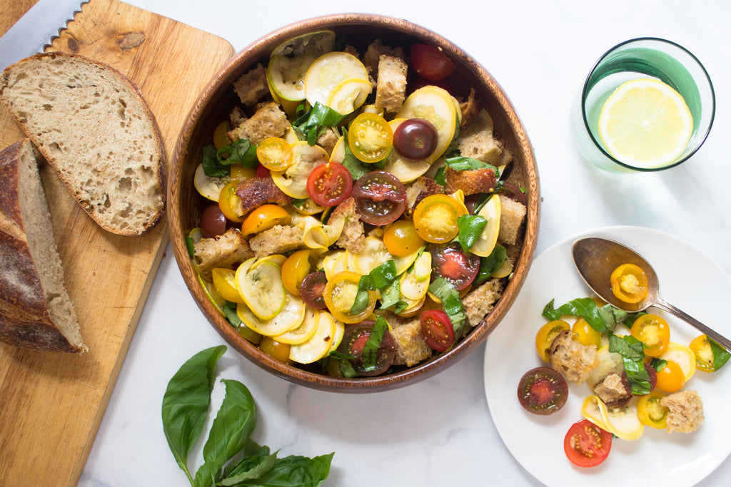 Using a mandolin or sharp chef’s knife, cut squash into paper thin slices. Cut cherry tomatoes in half. Whisk together olive oil, red wine vinegar, garlic, salt and pepper. In a large salad bowl, toss together all the ingredients with basil leaves.
