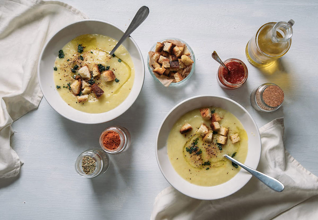 Melt butter in soup pot on stove over medium heat. Add leeks, garlic, sea salt, and pepper and sauté 5 minutes, until leek pieces are softened and translucent. Add sunchokes, broth, and bay leaf.