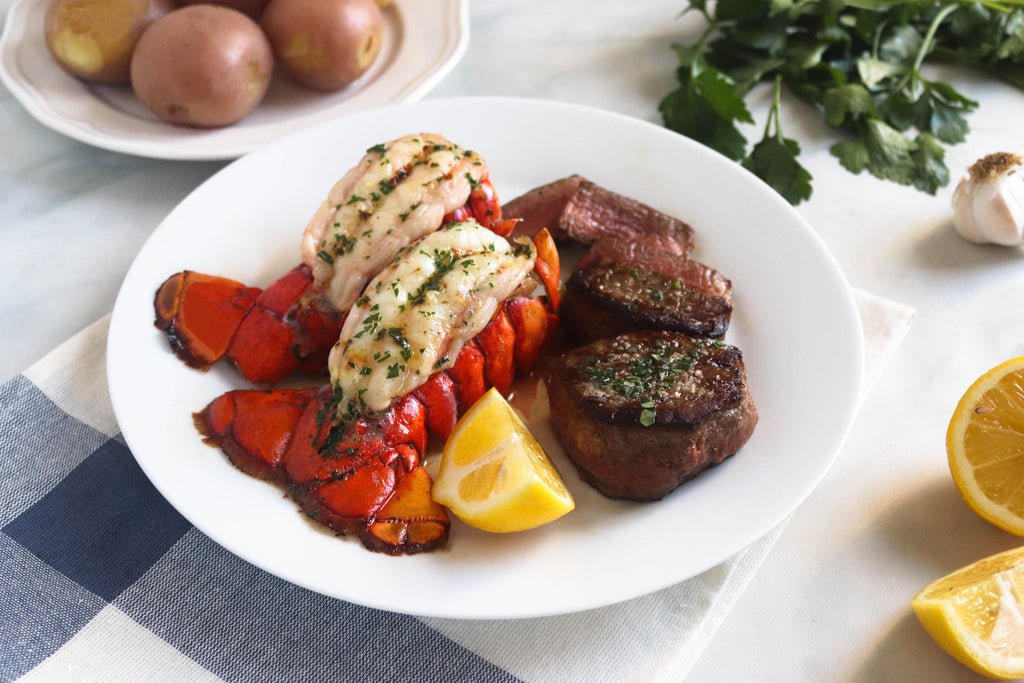 Heat 2 tablespoons butter, garlic, parsley and a pinch of sea salt in small pan until butter melts. Stir to combine. Place lobster tails on baking sheet or in oven-safe dish. Using kitchen shears, cut shell down to the fin. Using your fingers, gently pry meat from shell, keeping it attached at base of tail. Lift meat so it rests on top of split shell. Season with sea salt and pepper and brush garlic butter sauce over top of lobster tails. Broil 10 minutes, brushing with remaining garlic butter halfway through, until cooked. Lobster tails should be opaque white and internal temperature 145 degrees. Squeeze with lemon before serving.