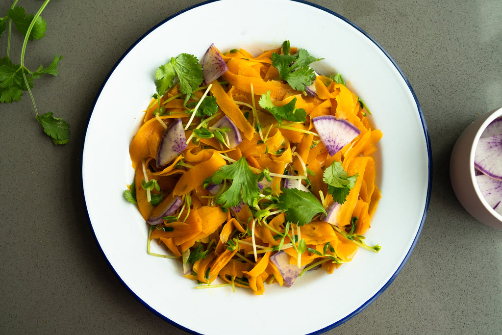 Using a vegetable peeler, slice your sweet potatoes into thin ribbons.
