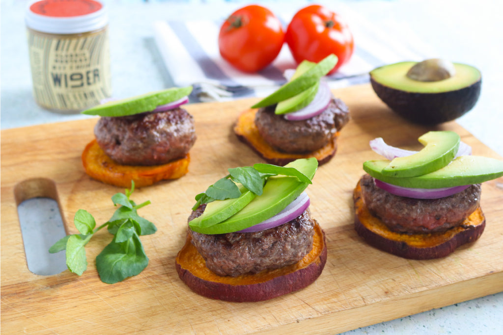 Place patties in the pan – it should be hot enough that they sizzle. At no point should you squash the burger – keep the juices inside! Cook until the first side is well browned, then flip. Remove from pan when they are done to your liking. Place patties on top of roasted sweet potato rounds and top with sliced avocado, onion and your favorite burger topping; then top with another sweet potato slice.