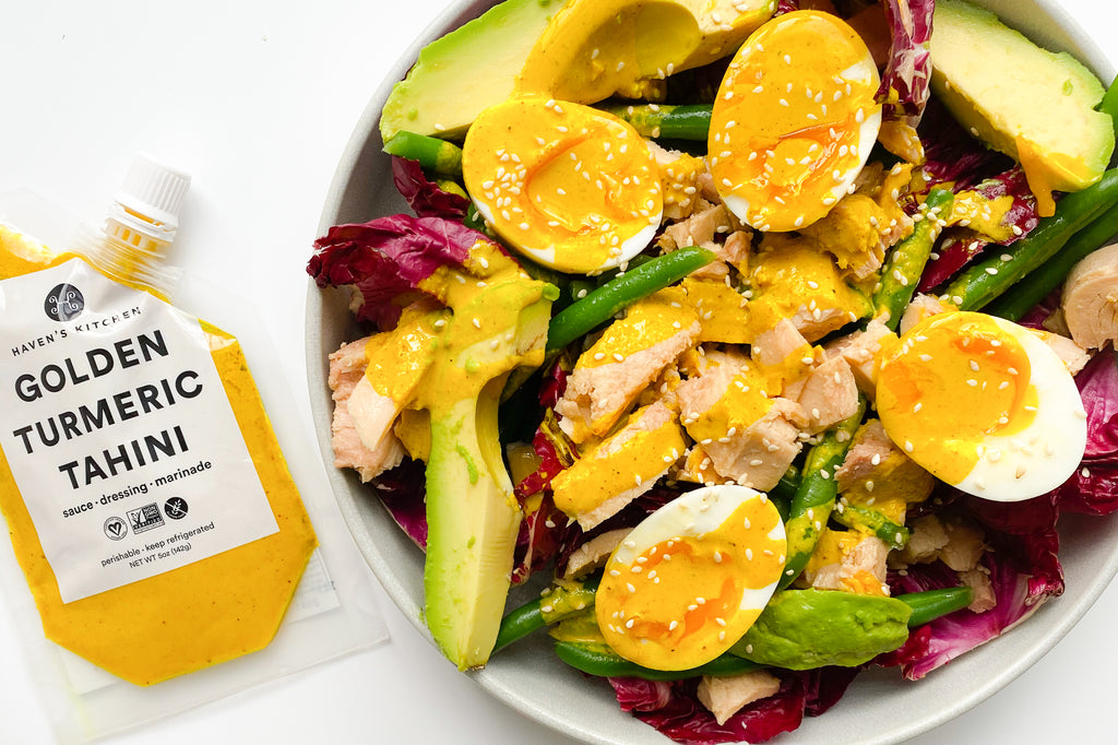 4.Slice eggs in half, lengthwise and lay on salad, then dress with Golden Tahini and sprinkle with pinch sea salt and sesame seeds