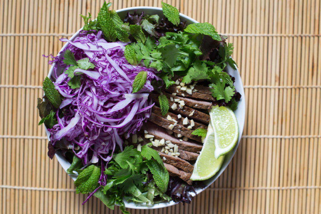 Begin by taking the steak out of the fridge 30 minutes before cooking. Season it generously on both sides with salt and pepper. Sear each side for 2-3 minutes to achieve your desired temperature. A steak like this tastes best when cooked hot and fast to medium rare. Let the steak cool while you prepare the rest of the salad. Pick the mint and cilantro leaves off their stems. Tear large mint leaves into half. Whisk together the juice from the lime, the soy sauce, fish sauce, shallot and olive oil. Taste and adjust the seasoning.Tear the lettuce into manageable pieces; wash and spin dry. Slice the steak thinly. Toss the greens and cabbage with the dressing. Divide the salad between two plates and top with the steak. Garnish with the mint, cilantro and peanuts.